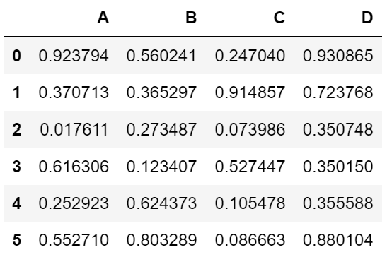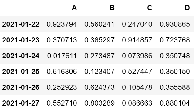 df = pd.DataFrame(np.random.rand(6, 4), index = pd.date_range('20210122', periods = 6), columns = ['A', 'B', 'C', 'D'])