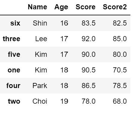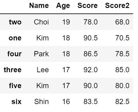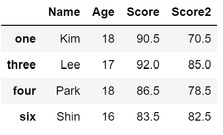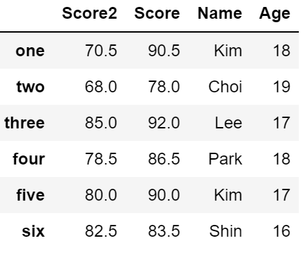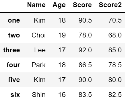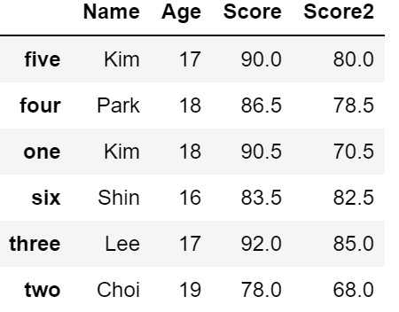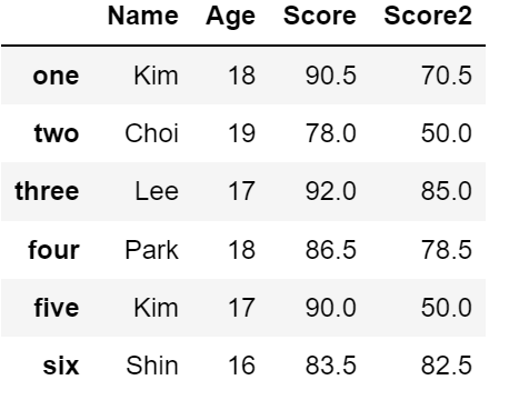 df2['Score2'].fillna({'two' : 68.0, 'five': 80.0}, inplace = True) # inplace = True : 저장